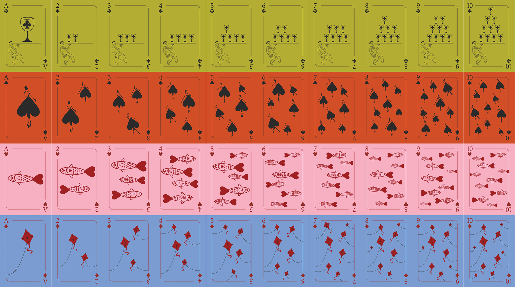 Once all artwork was complete, I assembled the full deck in Adobe InDesign. I created a consistent grid system to ensure proper alignment, margins, and bleed for print production. The final layout was prepared and formatted for in-class printing, resulting in a fully realized, custom-designed deck of cards ready for production.