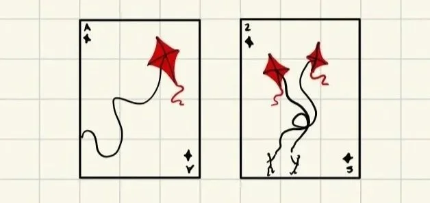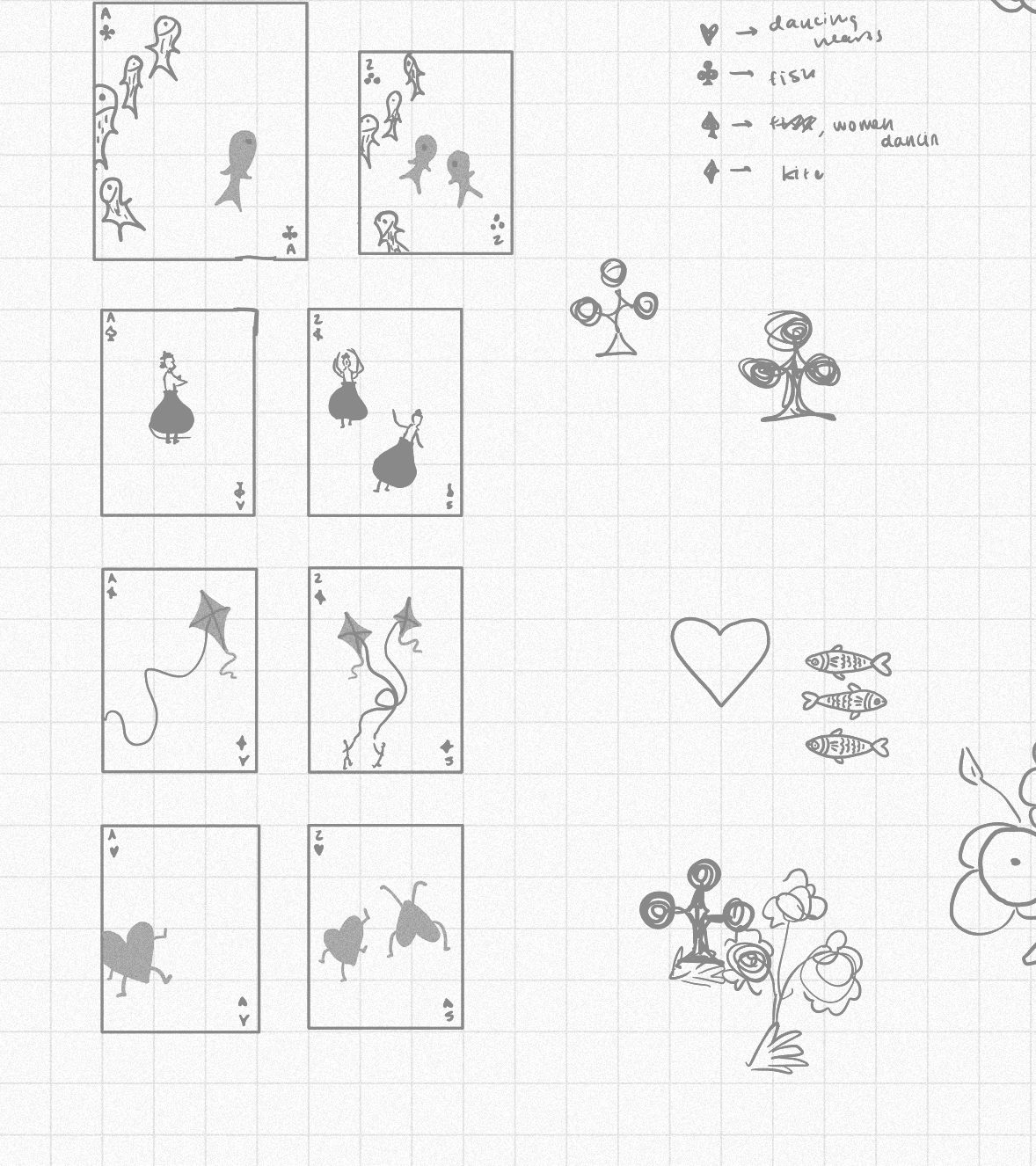 The goal here was to transform each traditional suit symbol into a complete piece of artwork. Rather than simply redesigning the icons, I wanted each symbol to become embedded within a larger visual composition while maintaining its recognizability. I began with rough sketches to explore how the core shapes could naturally translate into new imagery.