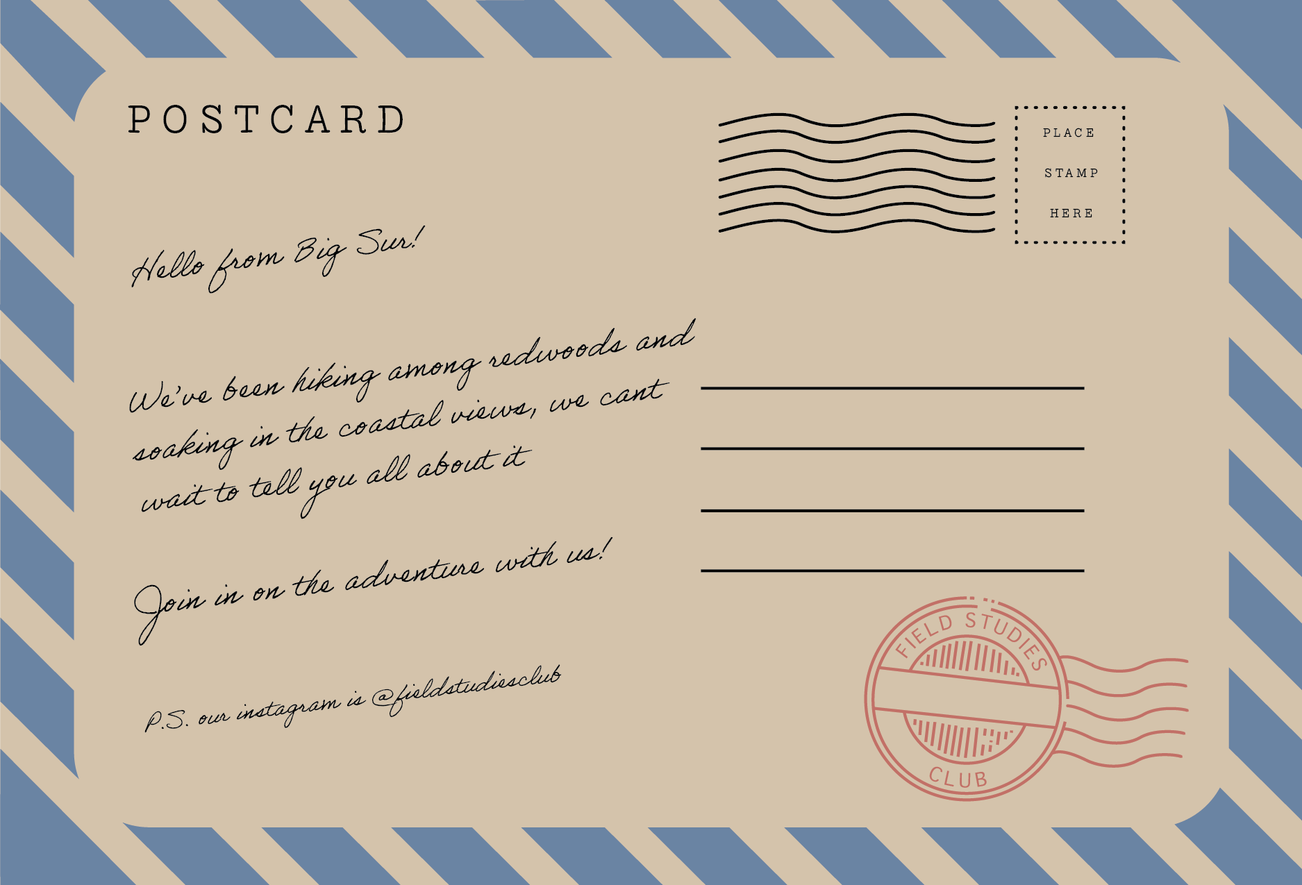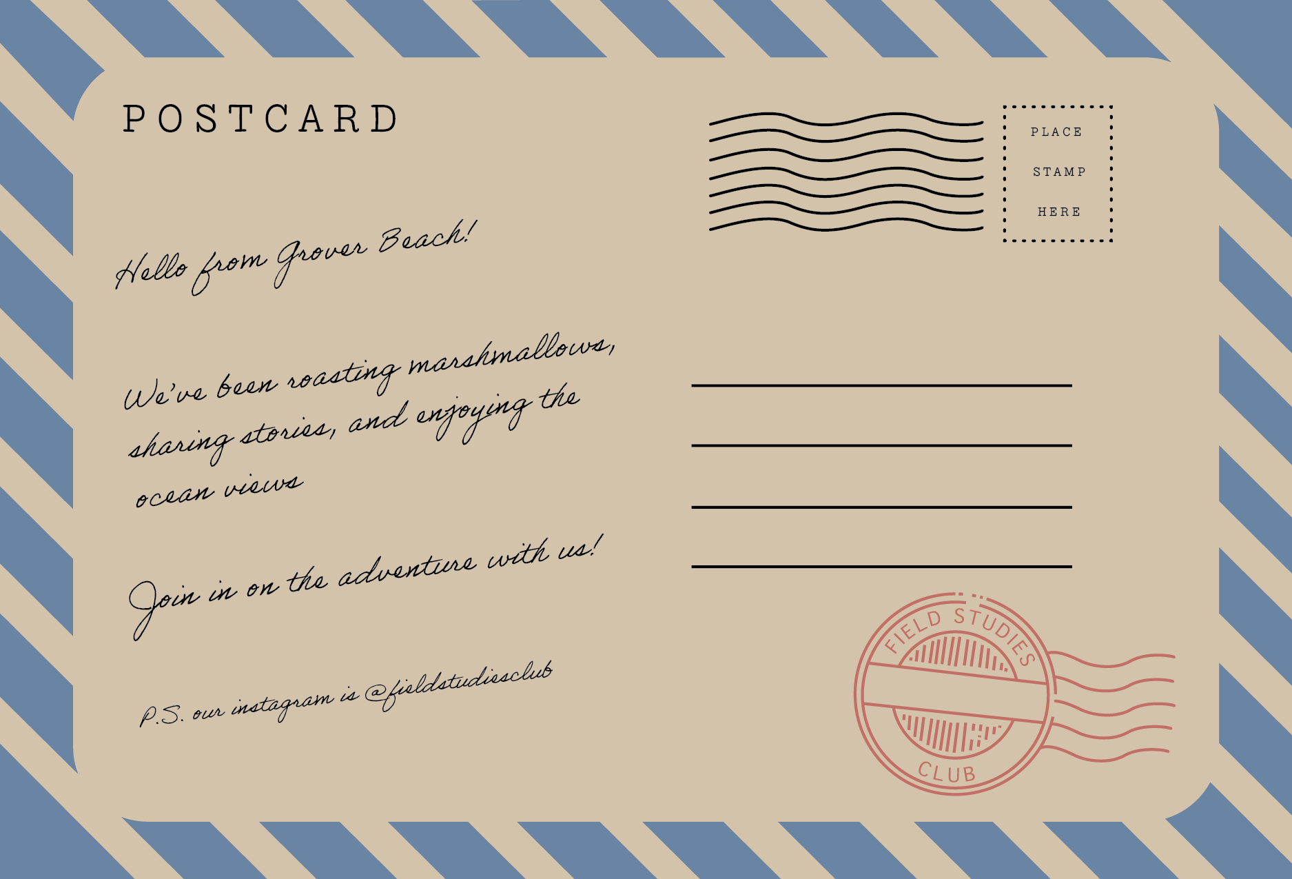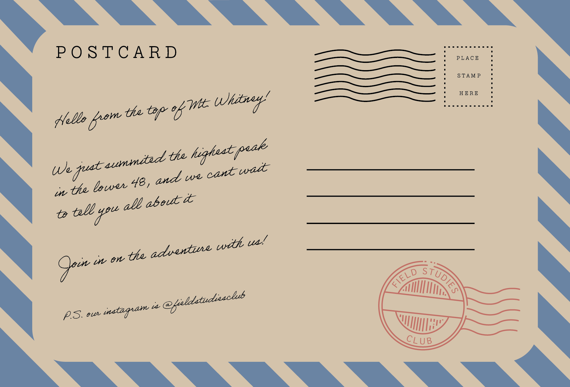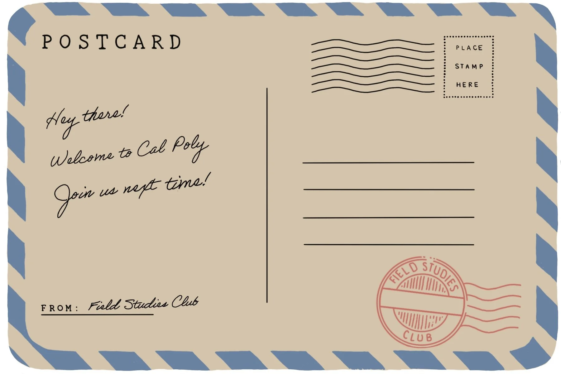 With recruitment playing a crucial role in Field Studies' success, I wanted to create something that felt personal and enticing to potential members. Designed to be eye-catching and informative, these postcards are a message from our team to potential members. They were passed out throughout our college campus, and invite viewers to connect with us and join the community.